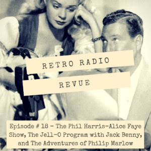 This is Episode 18 of Retro Radio Revue. This week we are featuring programs that had an original air date between October 21 through October 27. We’ll hear episodes from The Phil Harris-Alice Faye Show, The Jell-O Program Starring Jack Benny, and The Adventures of Philip Marlow.